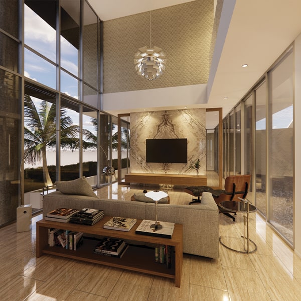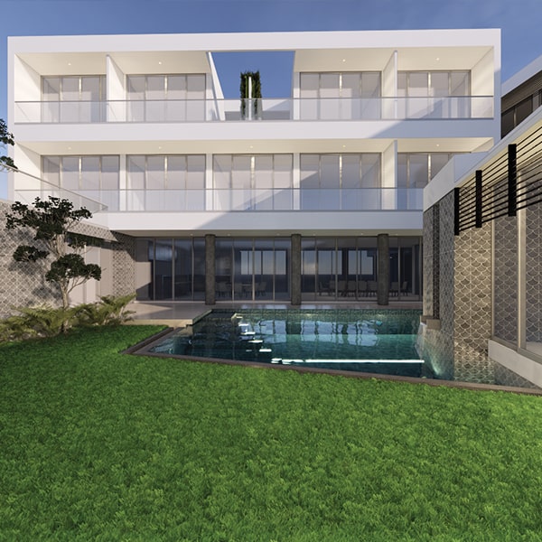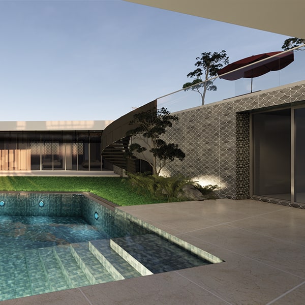The house encloses a private internal courtyard comprising a swimming pool, koi pond and garden. This courtyard brings daylight, breeze and ventilation deep into the home, integrating nature within the living spaces. The design is shaped by its surrounding context and the need for privacy, view and good ventilation. The client, a large multigenerational family in the seafood industry, consists of an ischemic stroke grandmother, three adults and five children. Requirements include parking for eight cars and two motorcycles, two living rooms, two dining rooms, a pantry and Asian kitchen, swimming pool, koi pond, two study rooms, five bedrooms and four suites, a suite for the grandmother with an on-call nurse, a guest room, meditation room, laundry area, and caretaker’s room. High ceilings and floor-to-ceiling openings were requested to enhance natural light and airflow.