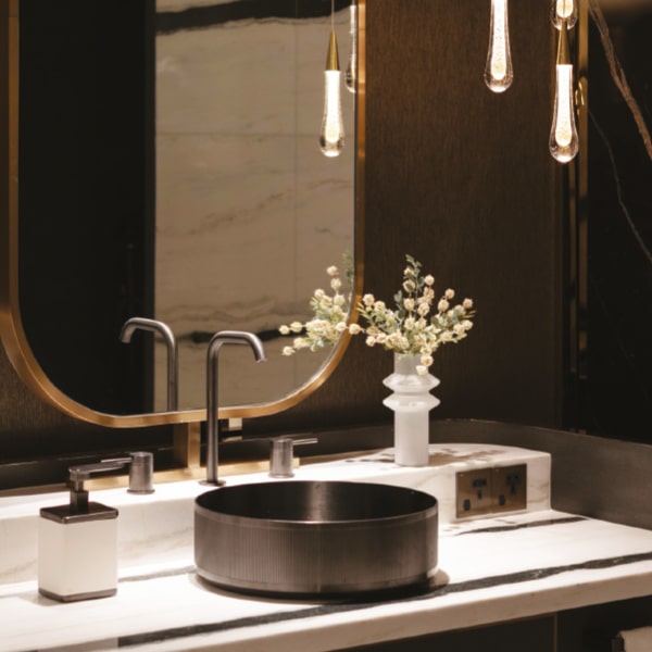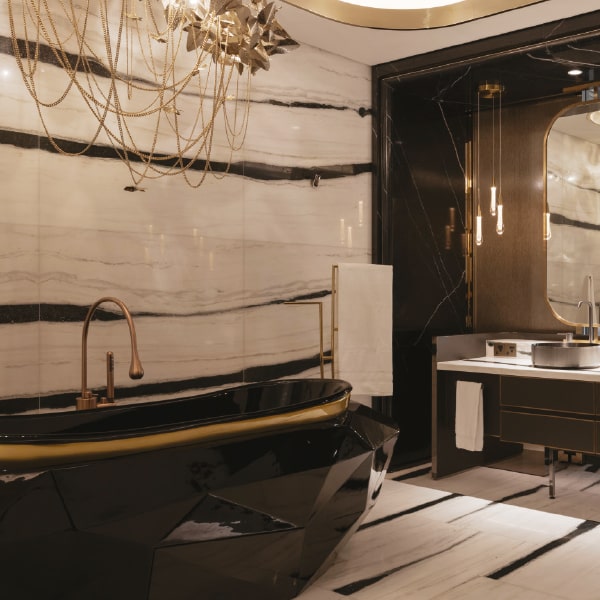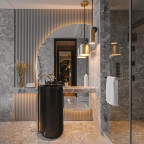 Ascending the marble staircase, the upper floor unveils private sanctuaries. The master suite exudes luxury, featuring a super king-sized bed, plush linens, and panoramic city views. The master bathroom, designed with a vision of pristine minimalism, celebrates clean lines and simplicity. Panda White marble adorns the walls and floors, creating a timeless black-and-white aesthetic. A freestanding, diamond-shaped bathtub by Boca do Lobo stands as a sculptural centerpiece. Completing the space, a smart WC, rain shower, and twin basin vanity ensure a perfect balance of luxury and functionality.