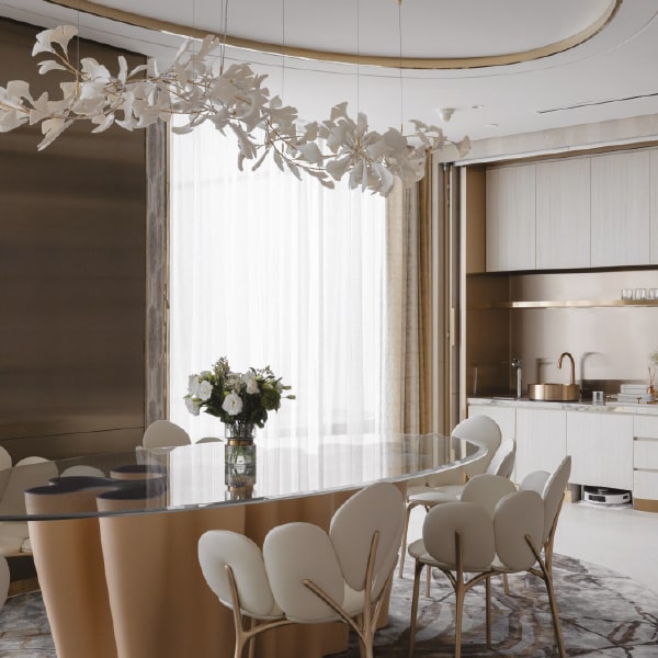 The living, dining, and dry kitchen areas span 1,825 sq. ft., uniformly connected in an open layout. The formal living area, drenched in natural light, showcases a quartzite light that complements the city’s night-time views. Next to it is the formal dining area, featuring an eight-seater table all set for family get-togethers. The dry kitchen, practical yet stylish, includes a kitchen island perfect for casual conversations.