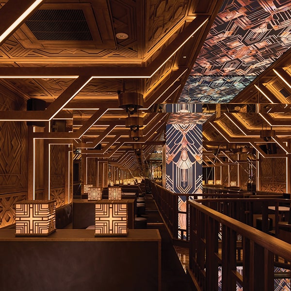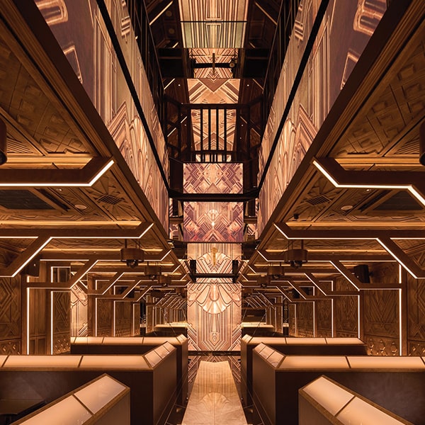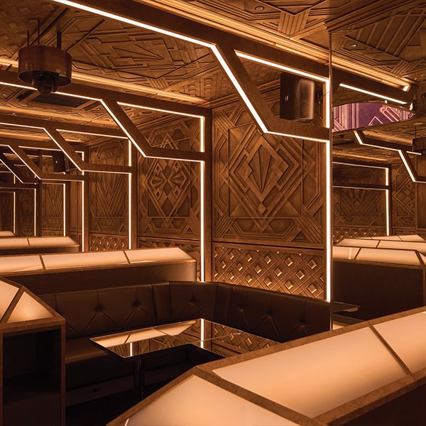 A classic 1920s-style sign marks the entrance and reception, followed by a first atrium with a large, classical hanging light. An approach staircase uses Art Deco mirror designs to dramatic effect. The ladies’ restroom is fully finished with mirrors on the ceiling and walls, creating a unique atmosphere. Customer seating ensures privacy while maintaining a sense of unity, using futuristic indirect lighting. From the atrium, LED screens enhance spatial unity. The stage and runway features marble inlay, showcasing dazzling performances.