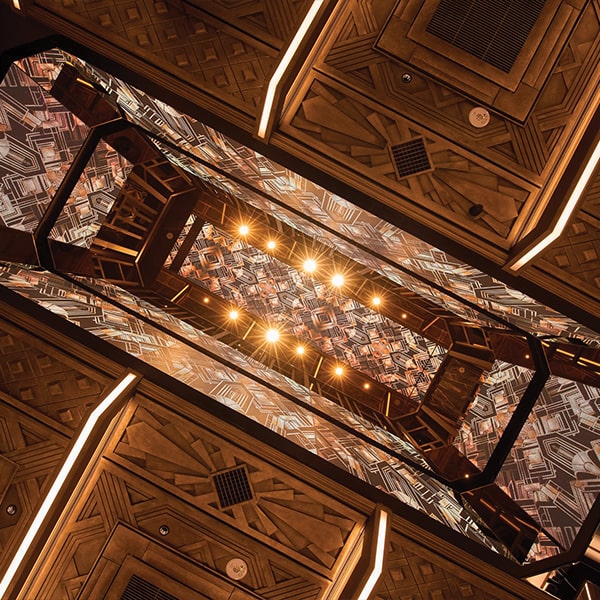 The interior pays homage to the Art Deco style that was popular in New York around 100 years ago, creating an opulent and dazzling environment. For this new two-floor development, a large atrium with a multi-layered spatial configuration has been incorporated, featuring bold use of LED screens. A futuristic touch has been added by integrating cutting-edge technology, resulting in an entertainment-rich atmosphere. This is the Art Deco Labyrinth. The design features black and gold tones throughout, with surfaces processed to appear aged over a century. Soft, milky-white acrylic lighting emits gentle illumination from within.