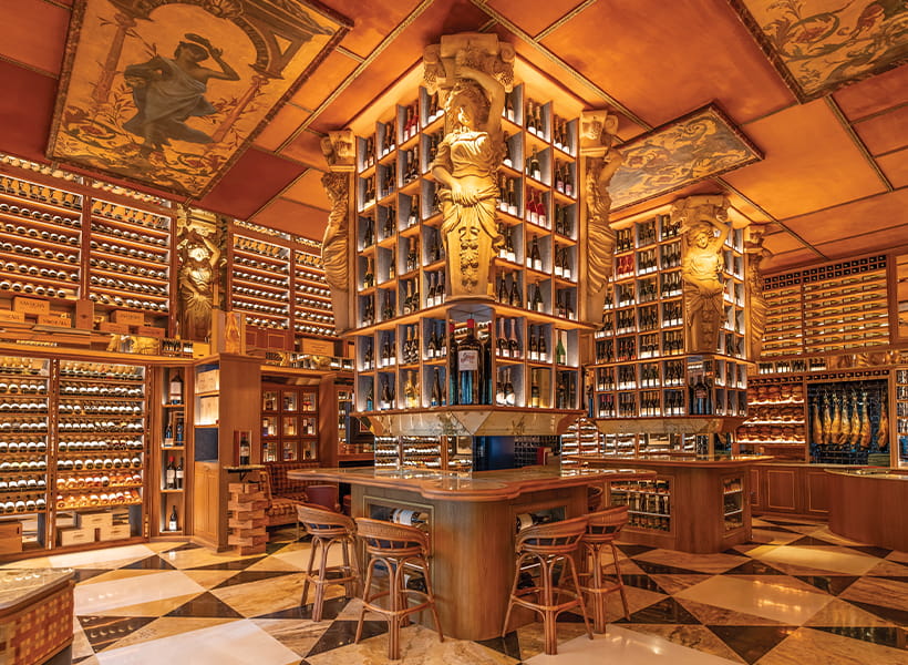 The Library Wine Boutique & Cuisine was created under the premise of paying homage to wine and transforming a shop into a setting for discovery, storytelling and pleasure. It is a place where design accompanies and envelops, allowing wine and food to meet and celebrate each other. Authenticity and timelessness define the space, inspired by historic Madrid shops, with aged wood, stone, iron details and craftsmanship that speak of history. The dramatic entrance, monumental shelving and warm lighting introduce a magnificent library ambience. As the project evolved, it became a space where wine is experienced through an open kitchen, private dining rooms, tasting areas and a Cheese and Charcuterie Corner. Every element, from the woodwork and marble floors to fabrics and handcrafted details, creates an atmosphere both intimate and majestic.