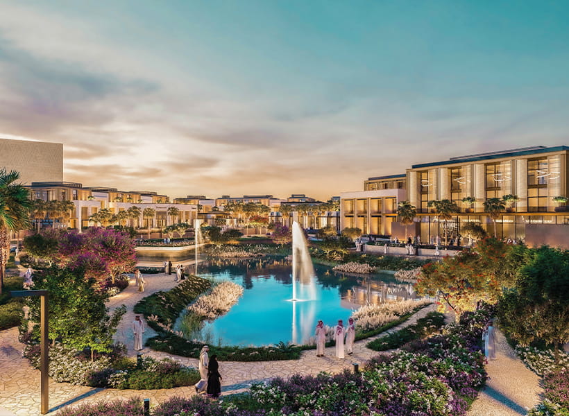 The design is guided by principles of luxury, functionality, and sustainability, integrating modern architecture with natural elements, anchored by a central lagoon and connected through the iconic Oud Drive. Smart circulation, wellness-driven design, and sustainability strategies align with Vision