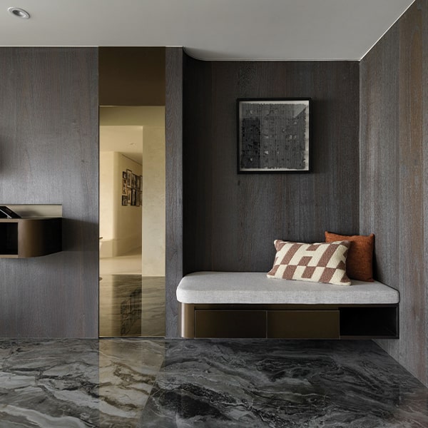 Original partitions were removed to improve circulation, with common areas in the centre and private areas on each side. Upon entry, a fluted glass screen, paired with floor-to-ceiling windows, intuitively redirects the flow of movement horizontally. A display platform at the entrance showcases rotating pieces, enriching the family’s daily routines.