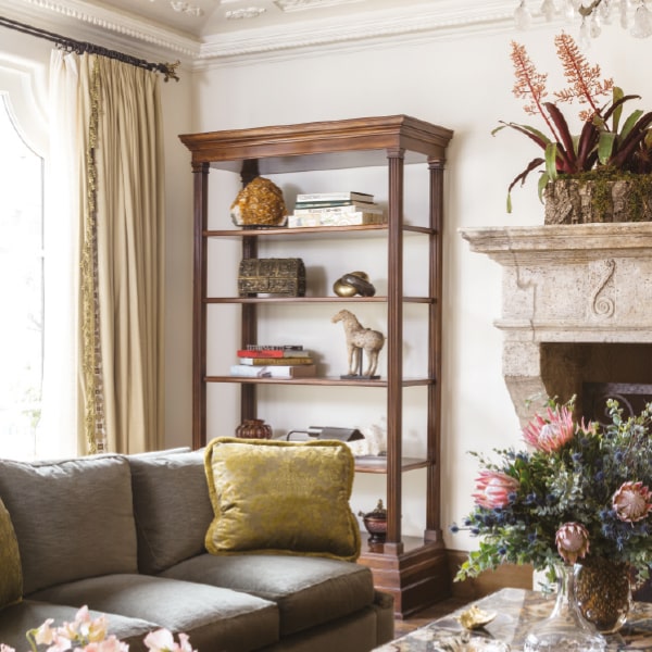 Drawing from the beauty of the landscape, as well as the Sangers’ Italian and French heritage, the design incorporates 18th-century antiques with modern touches. Key features include a Grand Hall with 20-foot ceilings and an antique limestone fireplace, an Art Deco-inspired cocktail bar with vintage details, and a family room open to gardens and olive orchards on three sides. Throughout the home, luxurious materials were used to create unique spaces, such as a Fortuny-draped bed in the primary suite, custom Italian cabinets and quartzite counters in the kitchen, and a bathtub carved from onyx in Jan Sanger’s bathroom. Each guest bedroom has its own colour scheme, with thoughtful touches like playful lime green accents for the grandchildren’s room.