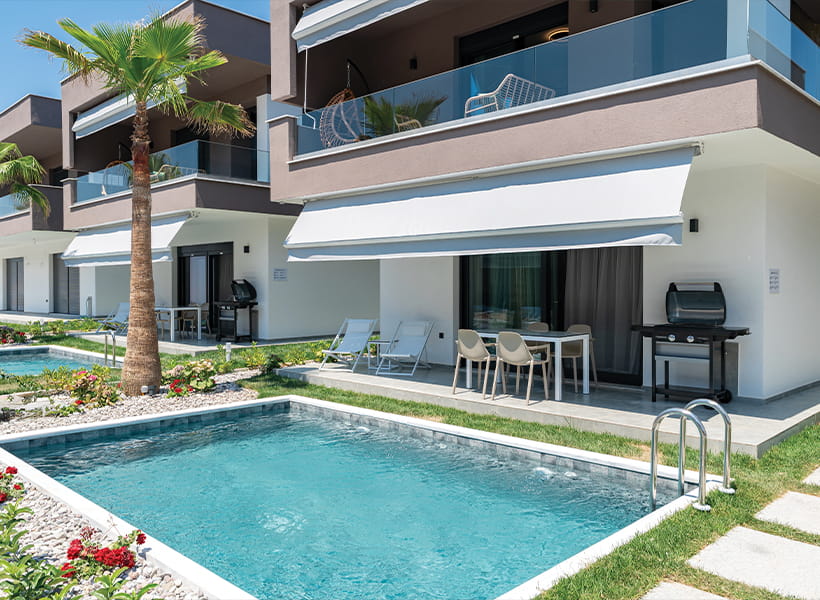 Building on this vision, Emerald Island in Thassos redefines seaside living just 70m from the coastline of Skala Rachoniou. The development comprises 29 independent residences emphasising elegance, functionality, and architectural unity. Select homes feature private pools and BBQ areas, while the design prioritises natural light, ventilation, and durable coastal materials. Privacy and openness are balanced through thoughtful spatial planning and orientation.