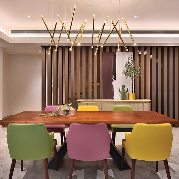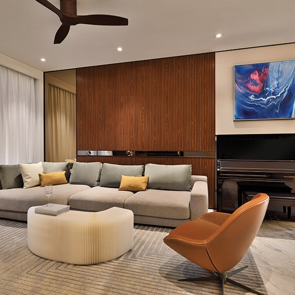 The Sonata Residence is a 4200 sq. ft. home in Singapore’s serene Bukit Timah district. The design reflects the family’s distinctive character and individual style, uniting a neutral palette with timeless elegance. Inspired by their love for music, the home includes a designated area for piano sessions without overt musical themes. Each space was crafted with meticulous planning, integrating textures, bespoke finishes, and curated furnishings. The foyer features marble flooring and rattan cabinetry, while the living area highlights fluted panels, a grey Olta sofa, and bronze mirrors. Gold decorative lighting, energy-efficient LEDs, and concealed sockets enhance sophistication.