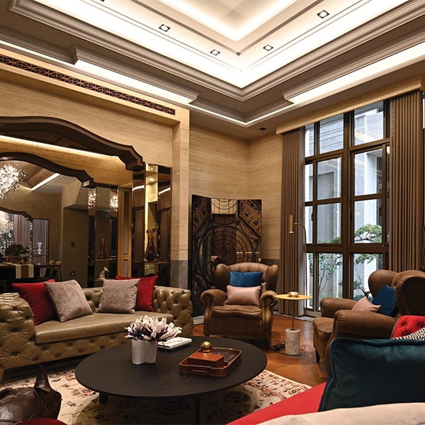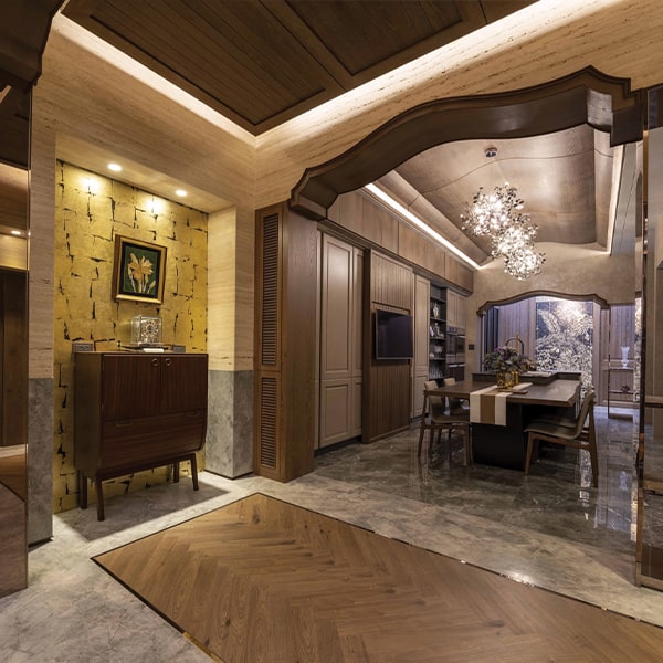 Preferring practicality over excessive ornamentation, the designer focused on functional hardware while enjoying the creative freedom given by the owner to explore bold new ideas. The design incorporates unique characteristics on each level, ensuring a cohesive yet dynamic flow throughout the home. In Taiwan, the ground floor of a residence is often used as the living room. However, this home features a salon, a gathering-hall-style space designed to impress. It showcases a classical Victorian style with Art Deco flairs. The multi-layered ceiling design conveys luxury yet without any garishness. Titanium-plated metal elements and travertine add to the variety of textures and colours.