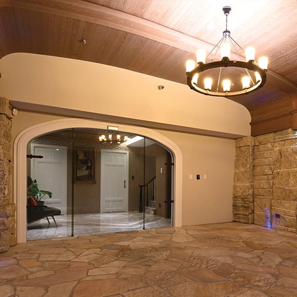 The family living room embraces a minimalist aesthetic. A seagull-wing-shaped facade ceiling disguises the unattractive structural beam. A wooden door hides the elevator door, and the maintenance panels are cleverly concealed to keep the look consistent, offering both clarity and calm within a considered space.