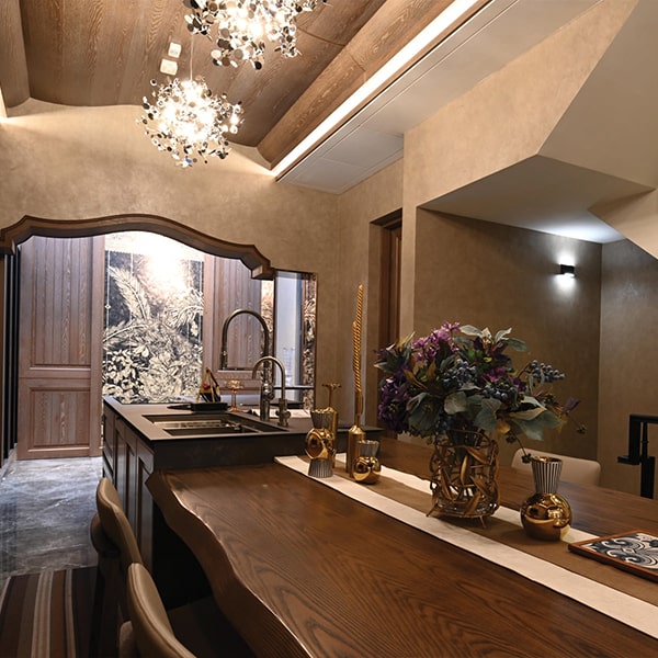 A small section of a wall on the ground floor is gilded, as requested by the owner. The designer turned the idea into an art piece with a distinctive vision, as if recreating a part of an ancient site in the house.